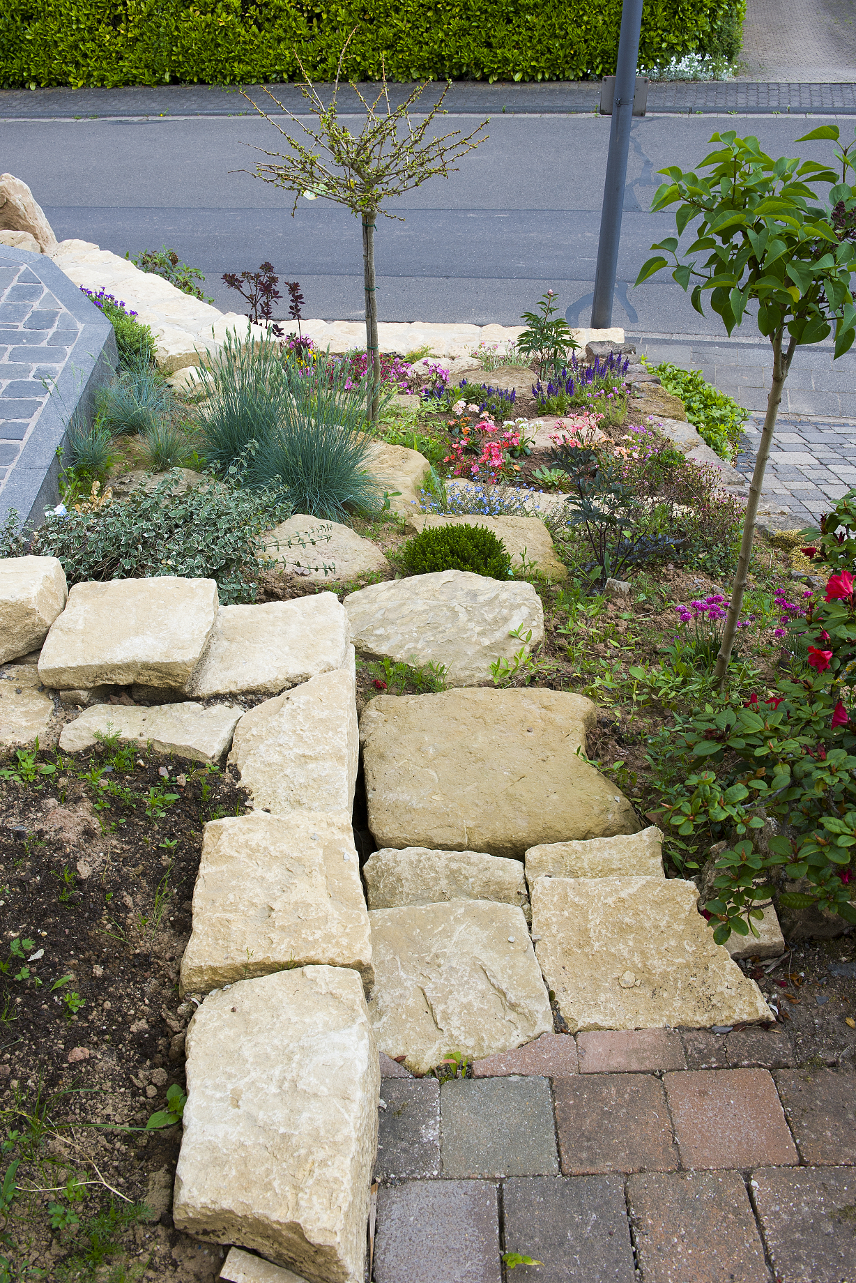 Neugestaltung des vorderen Hauseingangs, inklusive Terasse mit Stauraum darunter, Natursteintreppe, Neuanlegen der Beete, Trockenmauer aus Naturstein und Pflasterarbeiten.