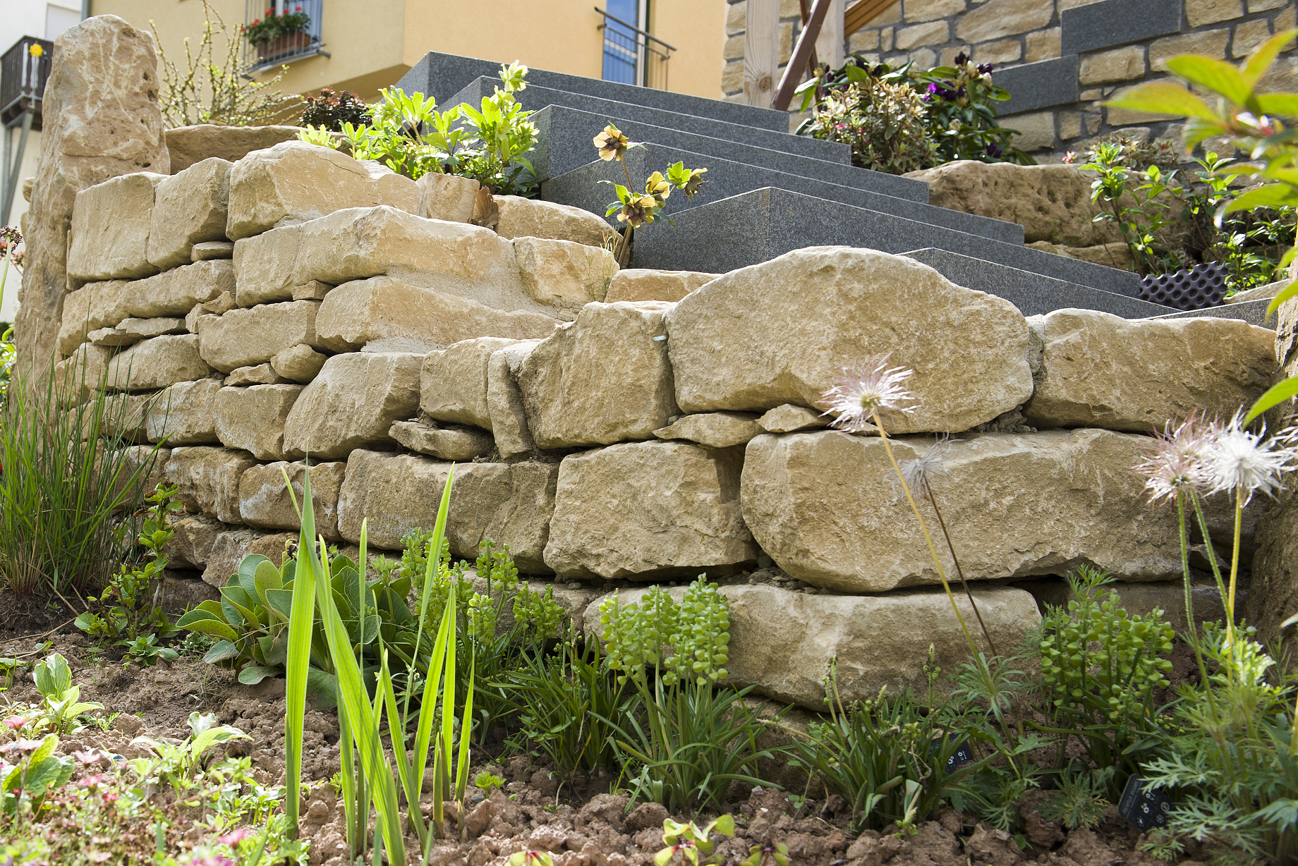 Neugestaltung des vorderen Hauseingangs: Setzen einer Natursteintreppe, die vor der Eingangstüre in eine Terasse (mit Stauraum darunter) mündet, Trockenmauer aus Naturstein, Neuanlegen der Beete und Pflasterarbeiten.
