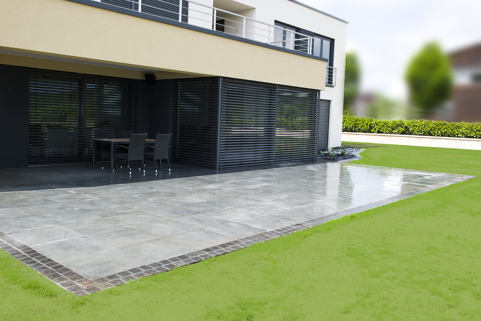 Eine große Terasse, eine lange Mauer, Steinbeete, ...